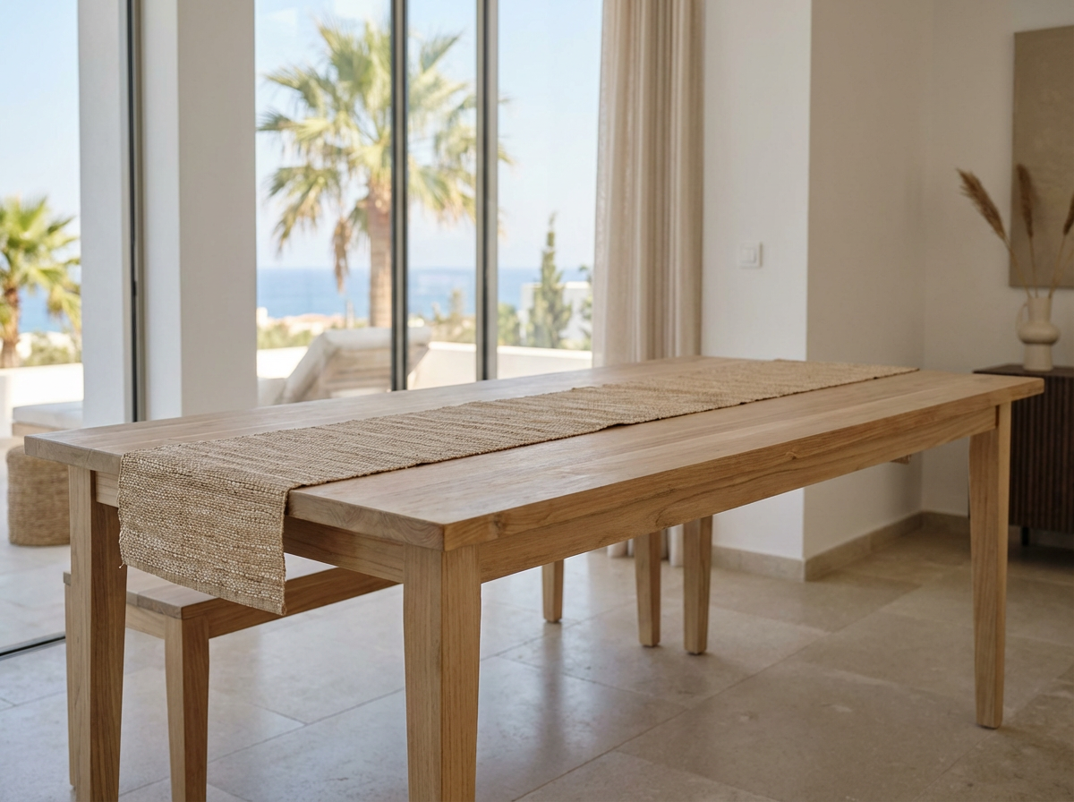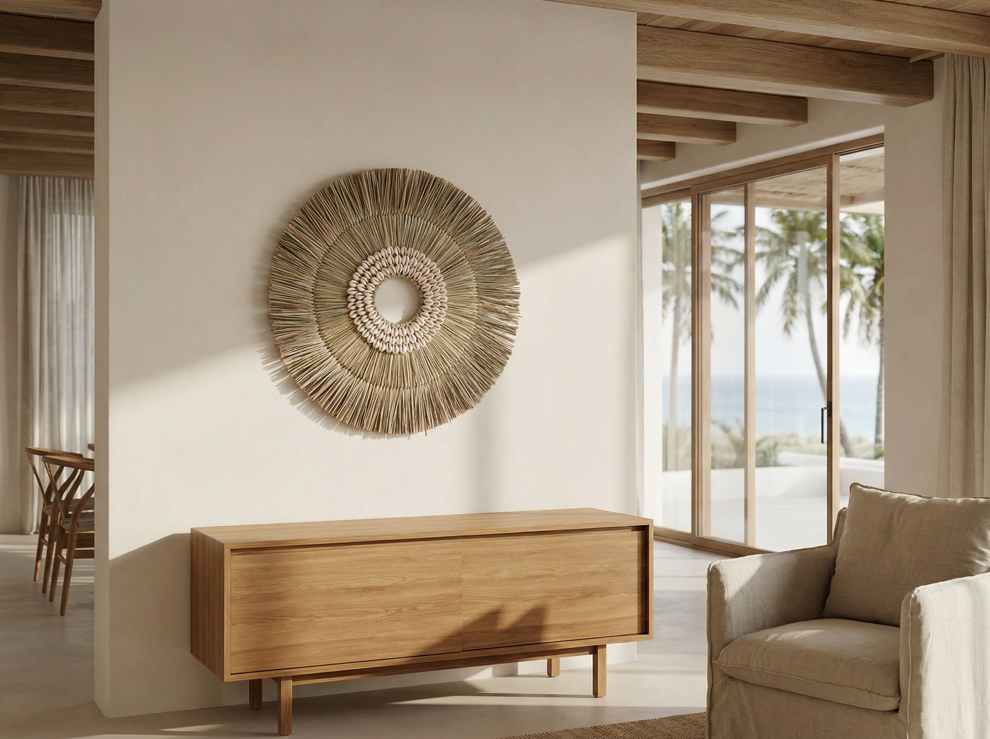 Natural fibres, solid teak accents and soft ceramic tones interact in a layered yet harmonious arrangement. Larger wall pieces introduce structure and presence, while refined tabletop elements add warmth and subtle detail.