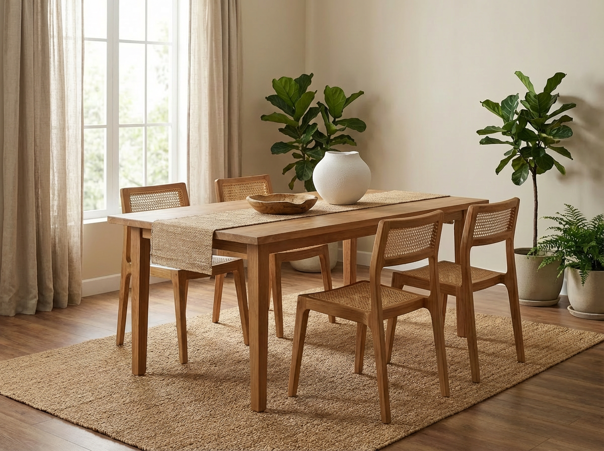Natural fibres and solid teak elements create a balanced composition that feels effortless and grounded. Each piece complements the others in tone and proportion, offering a subtle yet refined styling solution.