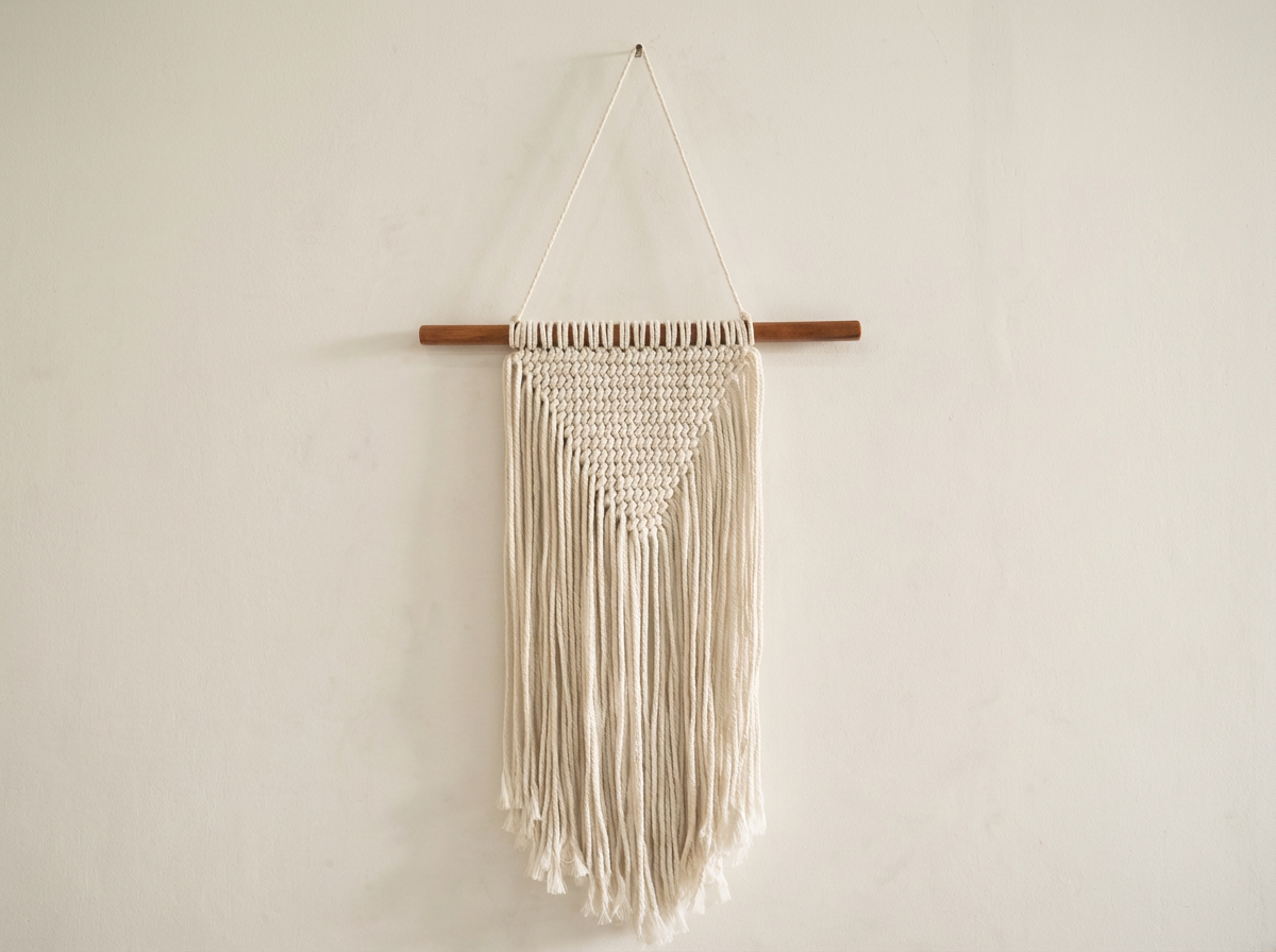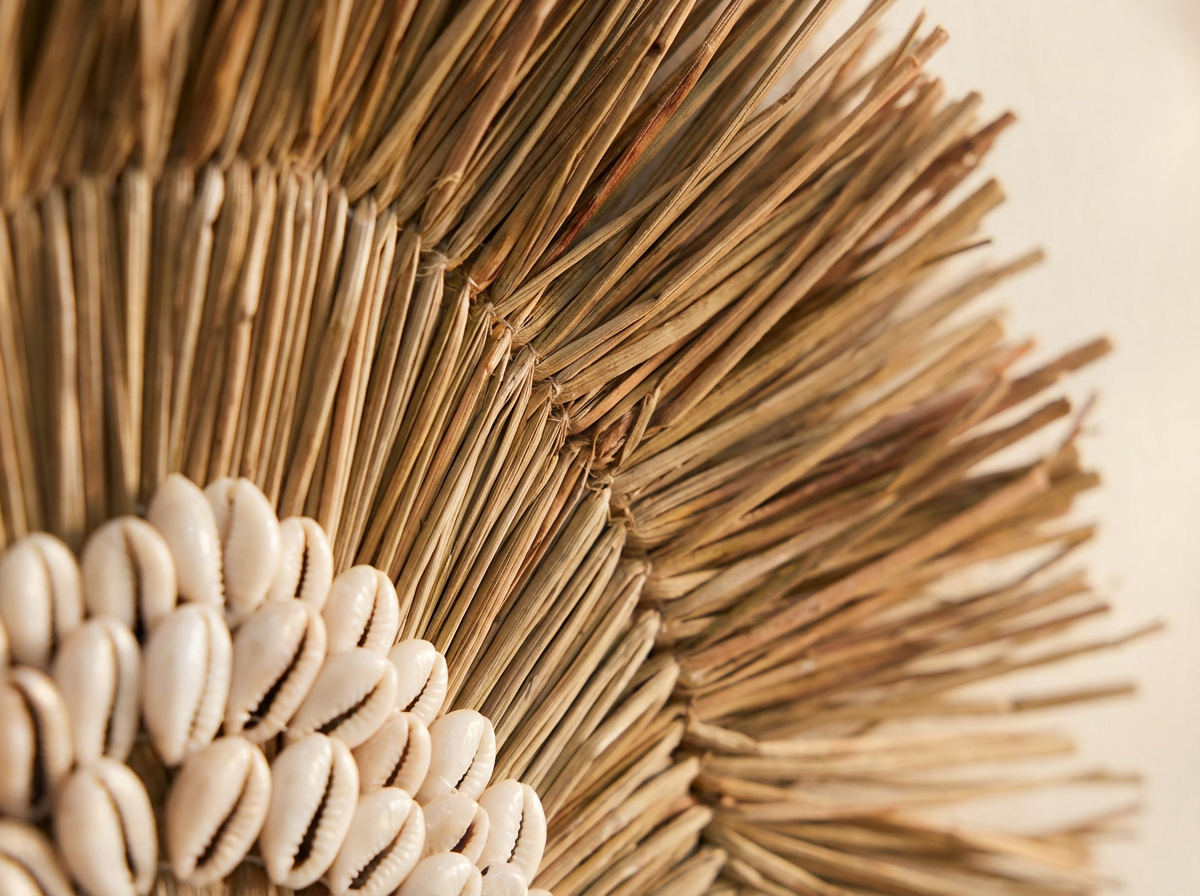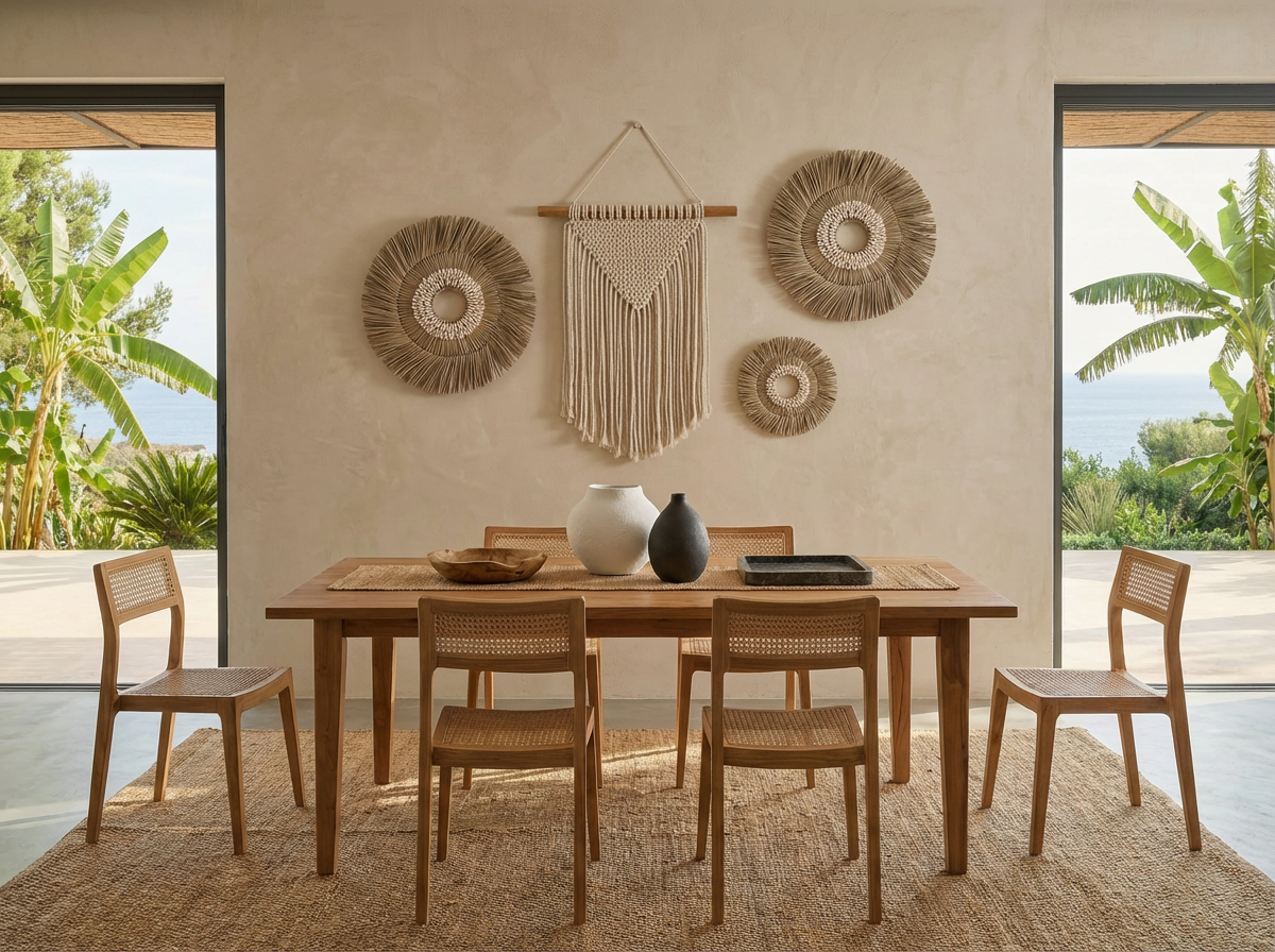 Natural fibres, solid teak accents and soft ceramic tones interact in a calm yet structured arrangement. A graduated wall installation — large, medium and small elements — introduces rhythm and depth, while carefully selected tabletop pieces add warmth and quiet detail.