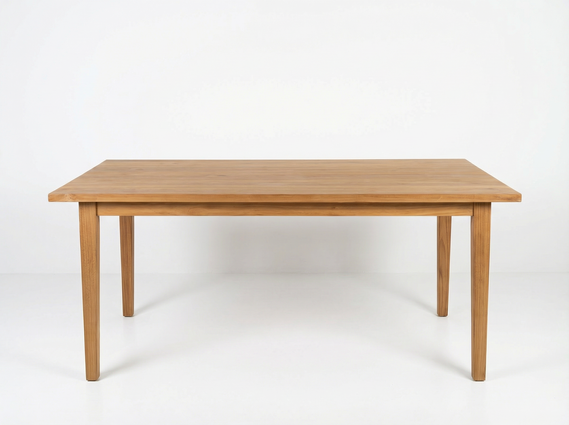 At the center of the set is a solid teak dining table. With its warm grain, natural matte finish and clean lines, it creates a quiet, grounding presence without overwhelming the space. The proportions are intentionally balanced, offering generous surface area while remaining perfectly suited for apartments, smaller dining areas or covered terraces.