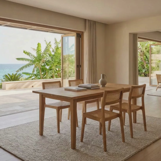 The table is paired with four dining chairs, crafted from solid teak wood and finished with natural rattan weaving. Carefully made and well balanced in proportion, they provide relaxed comfort and a timeless look that integrates effortlessly into both indoor and sheltered outdoor settings.