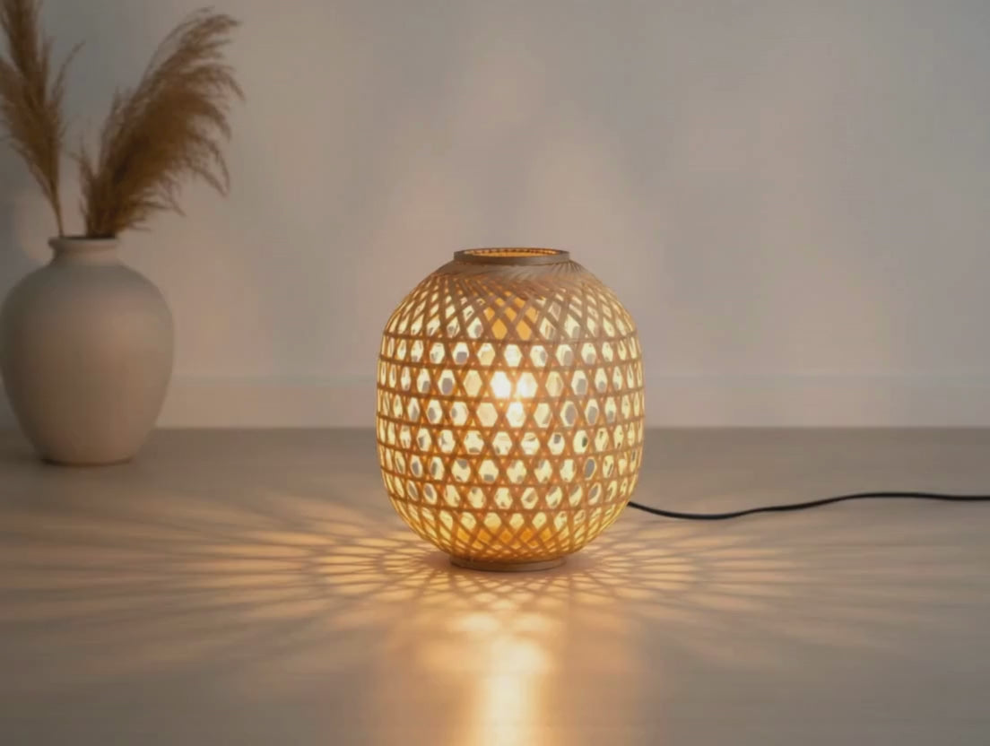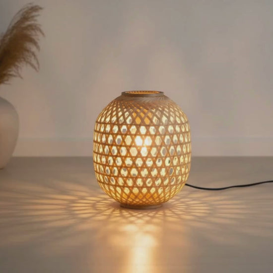 Woven from natural bamboo, the Serene Bamboo Floor Lantern brings a soft, calming glow to any space. Its open lattice weave allows warm light to gently spill across the room, creating inviting patterns on the floor and walls.