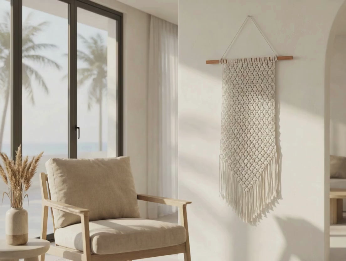 With its warm, tactile aesthetic, this wall hanging introduces a relaxed boho and coastal atmosphere that blends effortlessly with Bali, Japandi, and Mediterranean-inspired interiors.