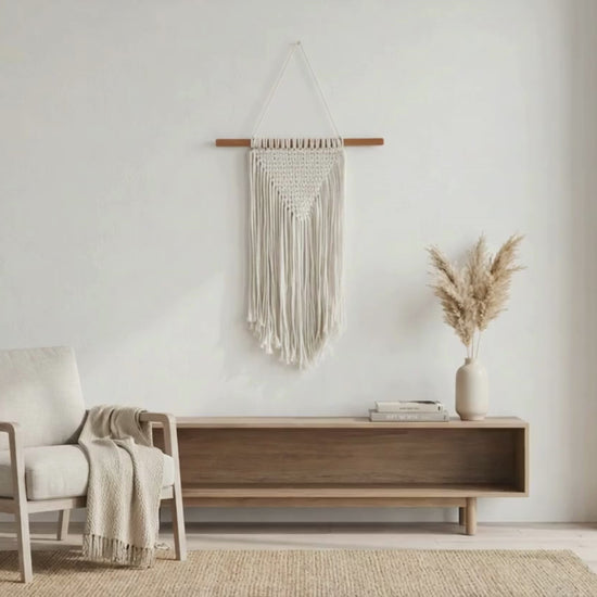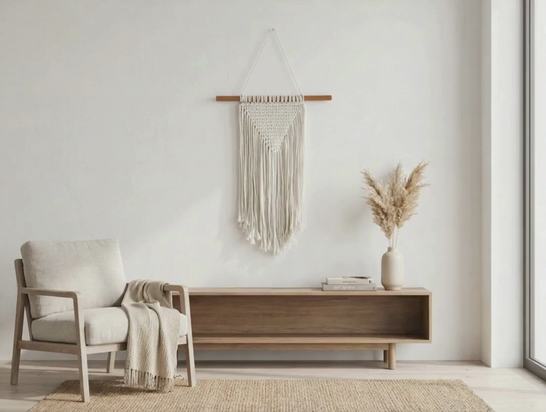The Dreamweave Macrame Medium is an intricately knotted wall hanging crafted from soft natural fibers, designed to bring gentle movement and a sense of calm into modern living spaces.