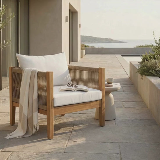 Its solid teak wood frame is paired with woven outdoor rope detailing, creating a balanced interplay of structure and softness that feels warm and inviting.