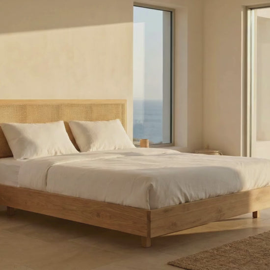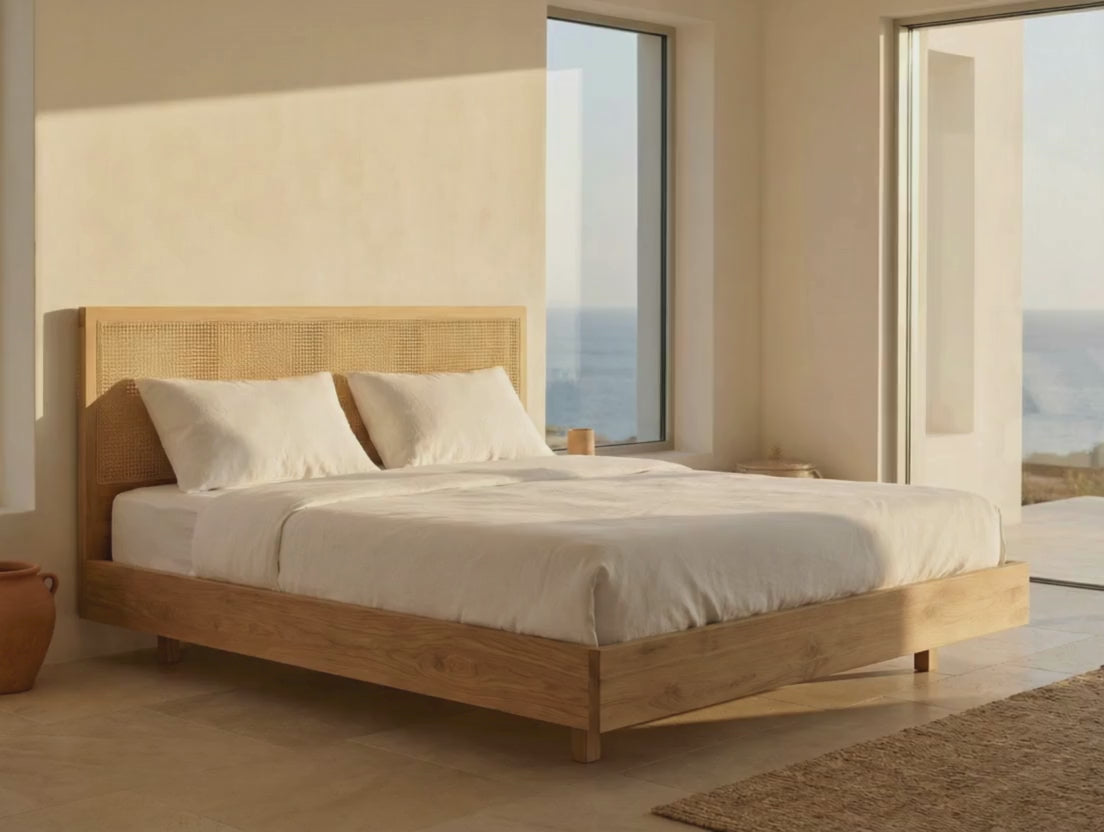 The rattan-inlay headboard adds gentle texture and warmth, creating visual depth without disrupting the minimalist silhouette.